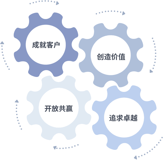 成就客户是一切决策的出发点,,,,创造价值是衡量所有工作的标准,,追求卓越是我们做事做人的态度,,,,开放共赢是我们的格局也是最终的结果。。。价值观的齿轮环环相扣,,推动着组织里的每个人不断向前。。