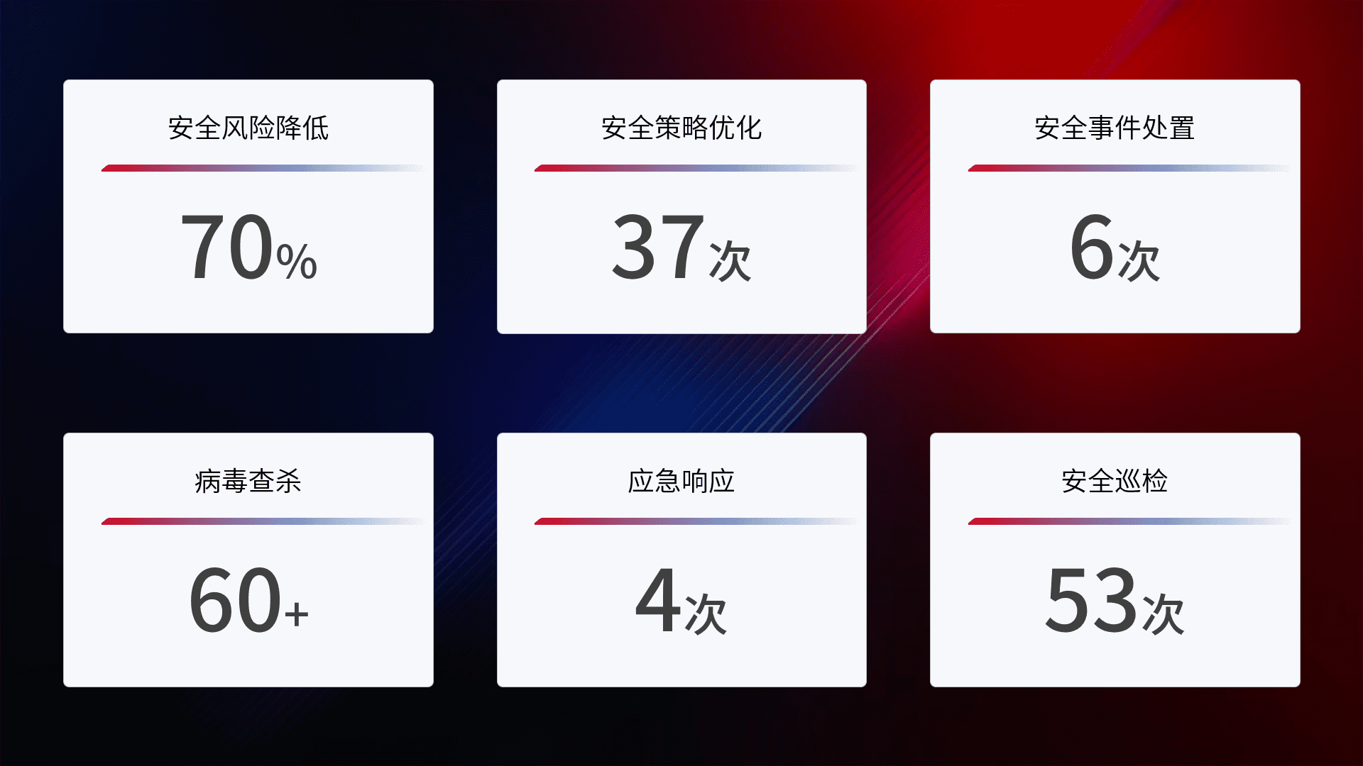 提供全面的安全事件报告体系,,包括处置报告、、、、周报、、、季度和年度总结,,,结合持续监控,,,,帮助客户深入了解网络安全状况。。。